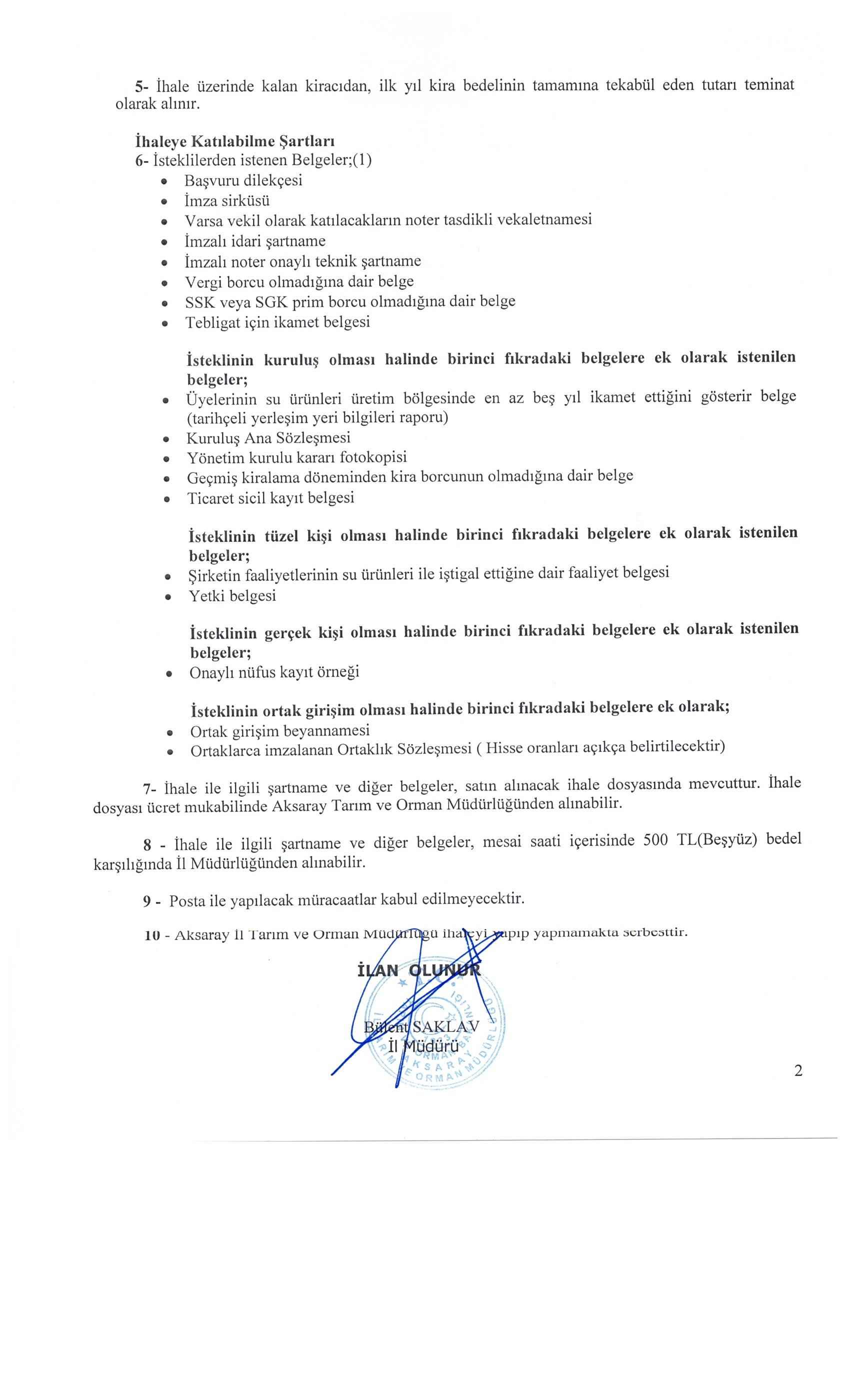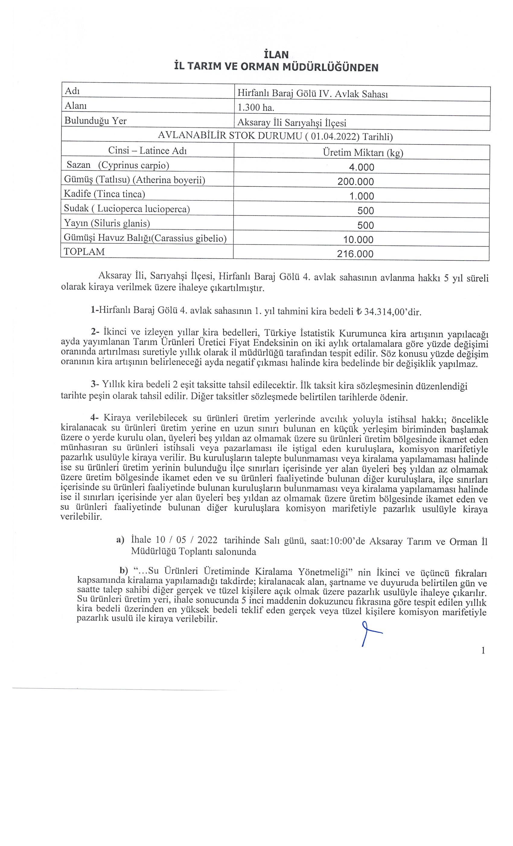 Aksaray ili sarıyahşi ilçesi hirfanlı baraj gölü 4.avlak sahasının 5 yıl süreli avlanma hakkının ihaleye verilmesi ilanı ekte sunulmuştur.